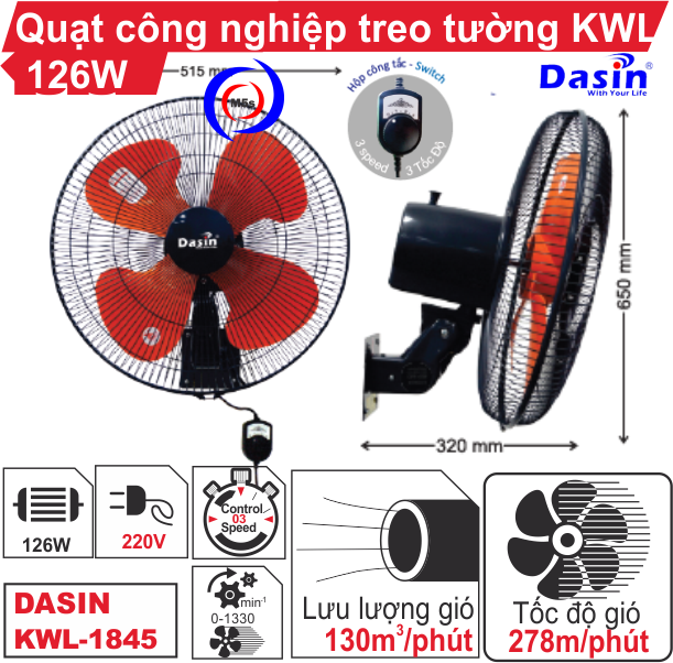 Quạt công nghiệp treo tường Dasin KWL-1845 được sản xuất trên dây chuyền tự động với công nghệ Đài Loan, chất liệu được nhập khẩu từ những nước tiên tiên trên thế giới như Nhật Bản.