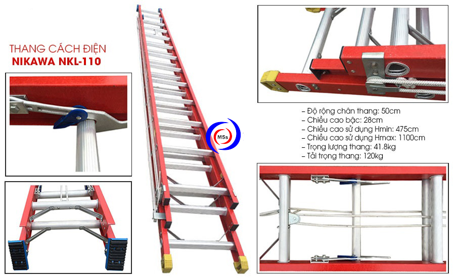 Thang trượt cách điện NKL-120 thiết kế gồm 3 đoạn trượt tiện lợi, chiều cao duỗi thẳng tối đa là 1200cm, chiều cao bậc thang là 28cm, giúp dễ dàng bước lên xuống an toàn. Thang có kích thước nhỏ gọn, trọng lượng 45.6kg, tiết kiệm không gian lưu trữ và dễ dàng mang theo khi làm việc.