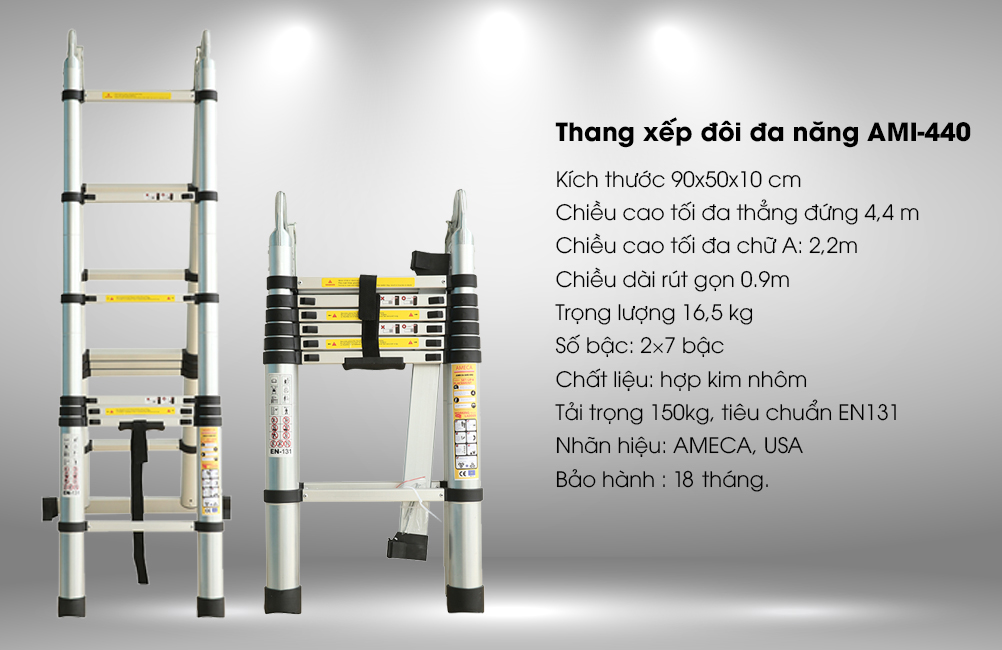 THANG NHÔM RÚT ĐÔI AMECA AMI-440 được sản xuất trên dây chuyền hiện đại, cho ra sản phẩm thang nhôm chất lượng, đạt tiêu chuẩn an toàn châu Âu EN131.