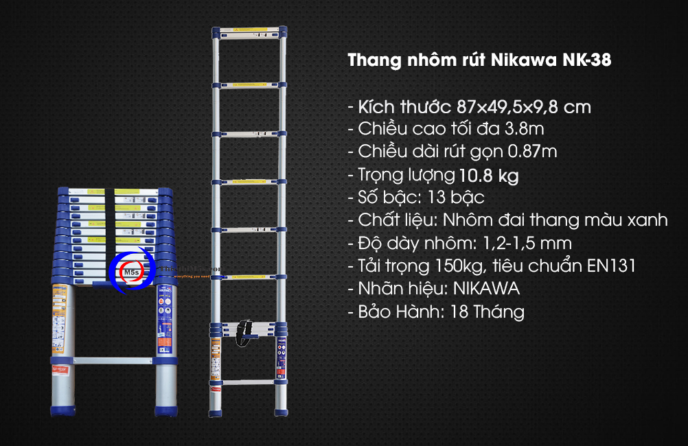 THANG NHÔM RÚT ĐƠN NIKAWA NK-38 là thương hiệu thang nhôm cao cấp đến từ Nhật Bản, có chất lượng vượt trội. Thang có thiết kế thông minh, dễ dàng thu gọn sau khi sử dụng hoặc tăng độ cao tùy theo mục đích và nhu cầu, độ cao tối đa lên đến 3.8m. Khả năng rút gọn của thang là nhờ vào các chốt khóa tự động trên thân thang.